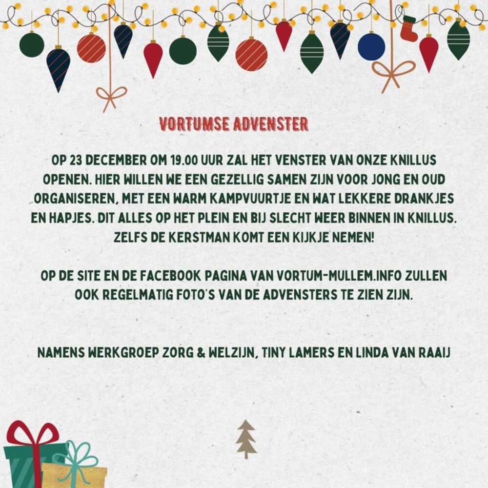 Zo ontdekken we iedere avond een nieuwe versiering en wordt ons dúrpke iedere dag mooier. Op de afbeelding bij dit bericht kun je zien op welke datum, welk aanvullend venster opent. Vanaf die dag tot en met kerst blijft dat venster iedere avond te zien.