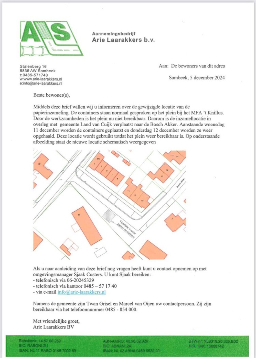 In overleg met gemeente Land van Cuijk en aannemer Arie Laarakkers is de inzamellocatie voor oud papier verplaatst naar de Bosch Akker. Zie ook begeleidend schrijven daarover van Laarakkers in bijgaande afbeelding.